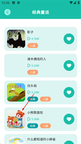 3、在经典童话故事列表页面,选择要收听的故事,进入故事播放页面。