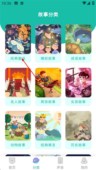1、在故事大王首页,点击底部分类选项,进入故事分类页面。