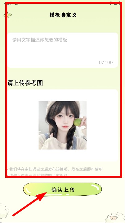 3、输入想要的模板描述,点击上传区域加号按钮,选择并上传参考图片。