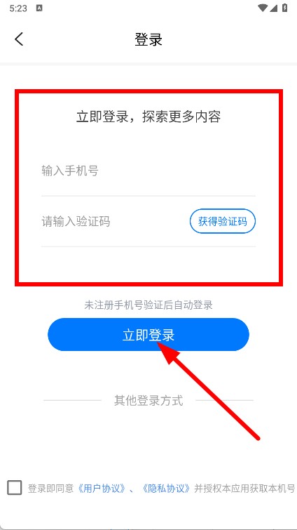 4、输入手机号,点击获得验证码,点击立即登录按钮,即可完成登录操作。