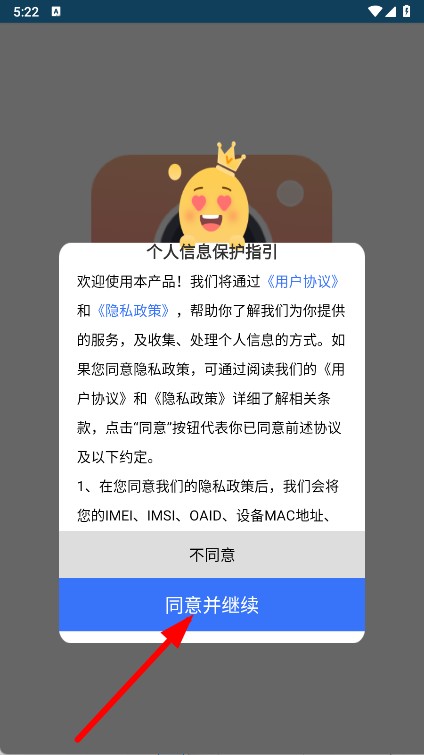 1、打开时光变老相机,在弹出的提示框中,点击同意并继续按钮。