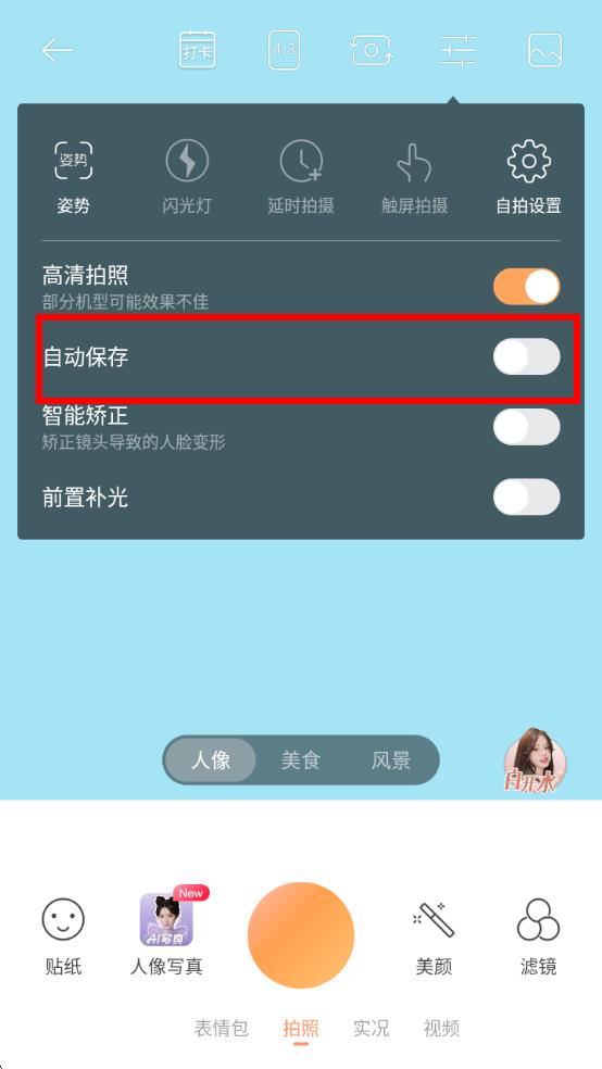 3、在展开的拍摄设置选项里,找到自动保存选项,点击其右侧的按钮,将其开启,即可完成无他相机自动保存照片的设置。