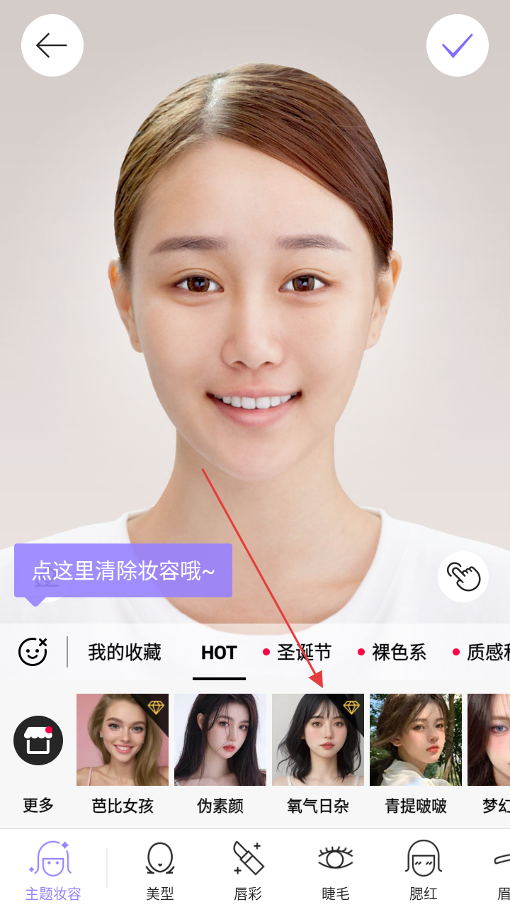 3、照片导入后,在下方的主题妆容等分类里,选择喜欢的妆容效果应用到照片,完成图片美化。