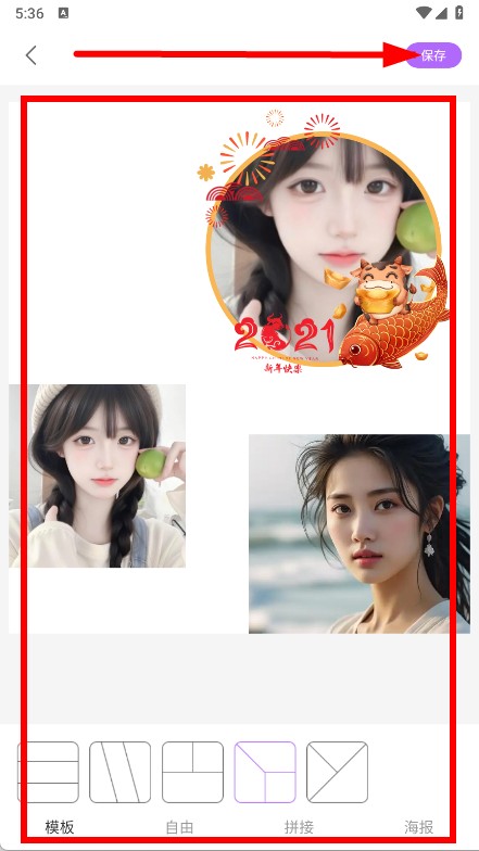 4、选择模板,自由,海报等拼接方式,完成拼图设置后,点击右上角的保存按钮。