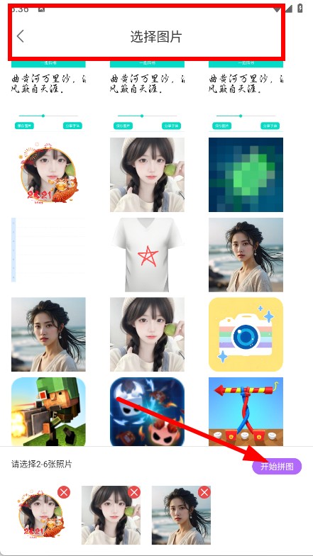 3、在选择图片页面,挑选2 - 6张需要拼接的图片,点击开始拼图按钮。
