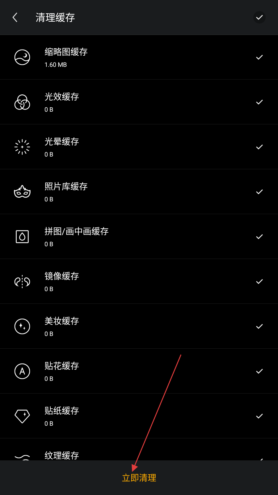 4、在清理缓存界面,可看到缩略图缓存、光效缓存等多种缓存类型,点击底部的立即清理按钮,即可清除所选的缓存数据。