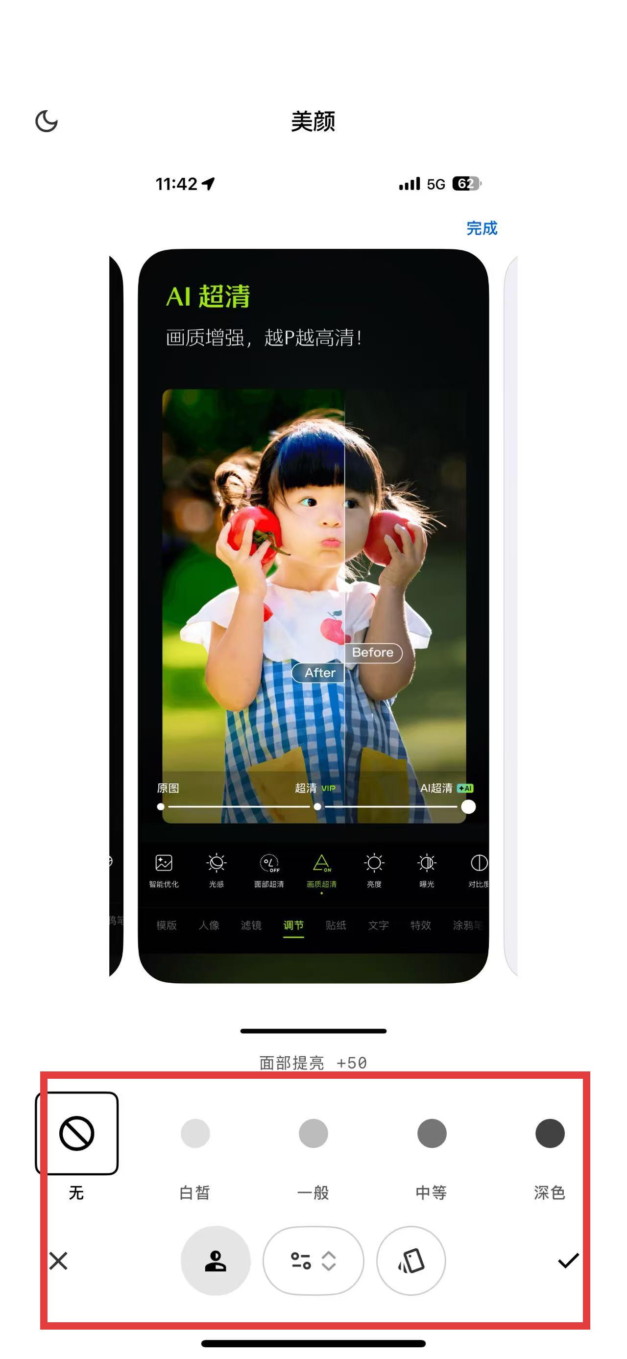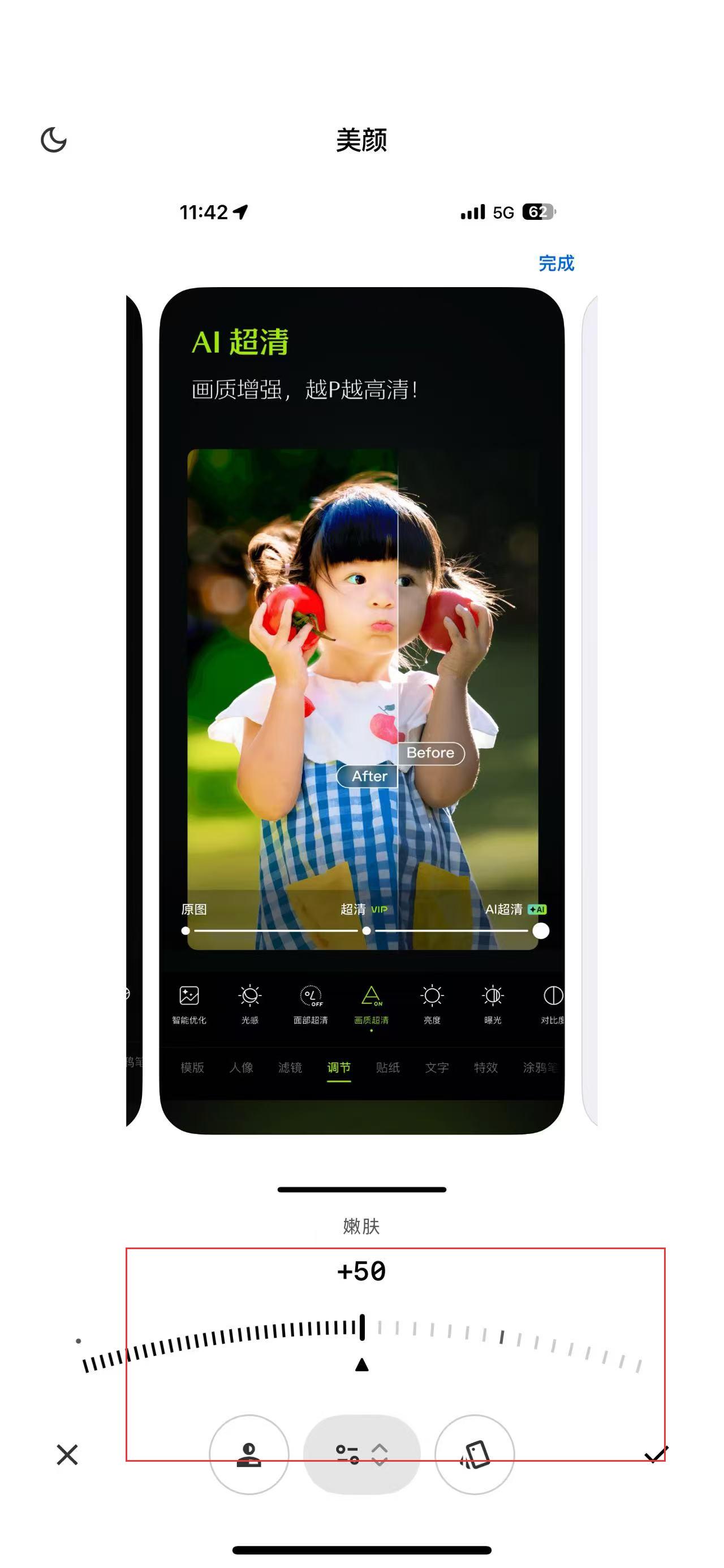 3、结合AI超清功能增强画质,完成后点击完成保存,让人像照片更精致,轻松打造细腻肤质与自然气色。