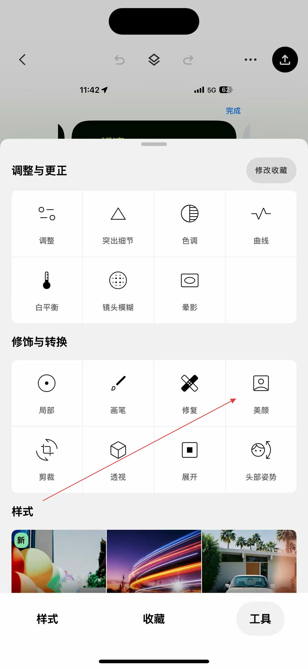 1、进入修图APP编辑界面,点击工具-美颜开启人像美化流程。