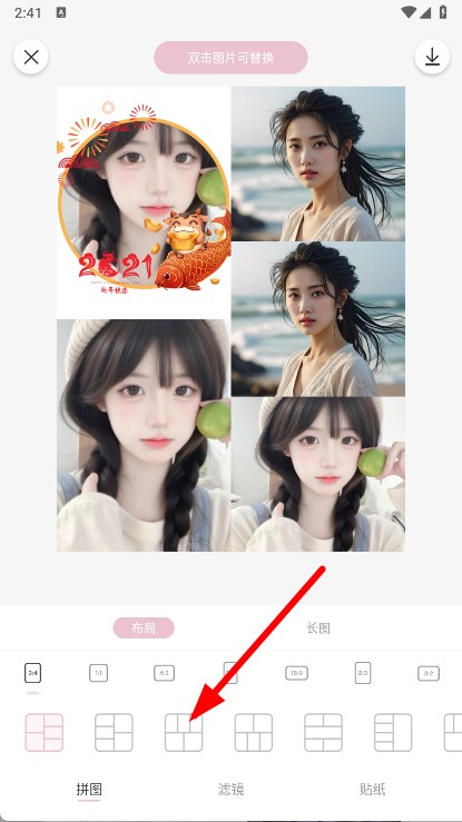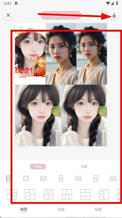 4、布局选择完成后,点击页面右上角的下载按钮,即可保存拼好的图片。