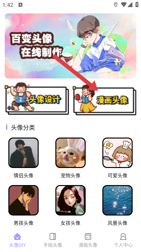 1、在头像DIY的页面,点击漫画头像的选项,进入漫画头像制作引导页。