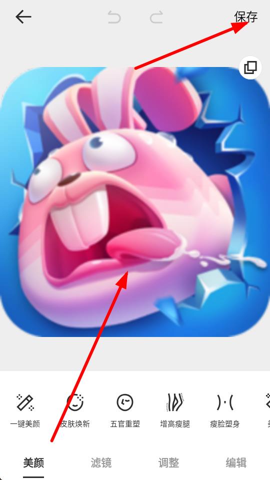 3、使用一键美颜等功能修图后,点击右上角保存完成操作。