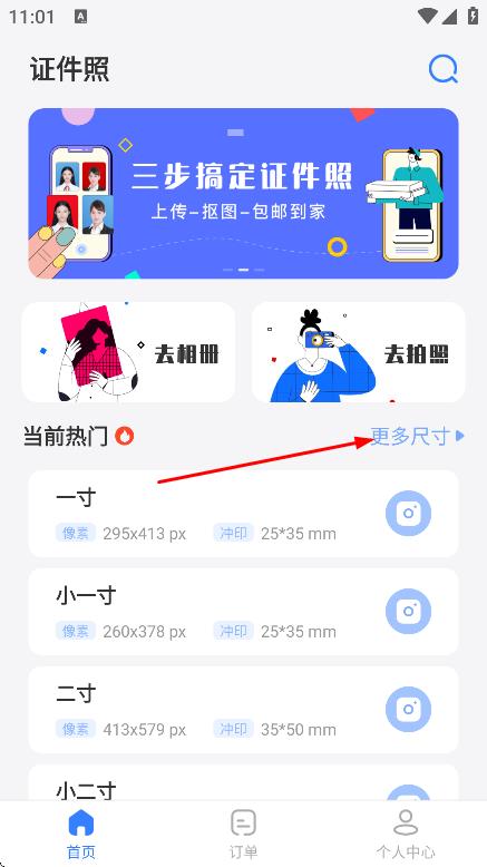 1、在首页,点击更多尺寸,进入证件照尺寸选择页面。