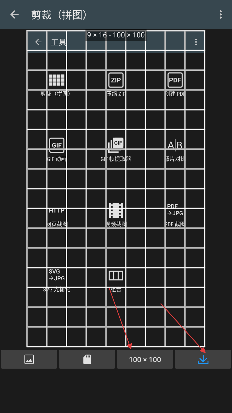 4、图片导入后,设置尺寸,再点击右下角下载按钮,完成剪裁拼图并保存。