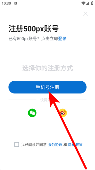 4、在注册方式页面,点击手机号注册,进入手机号登录页面。