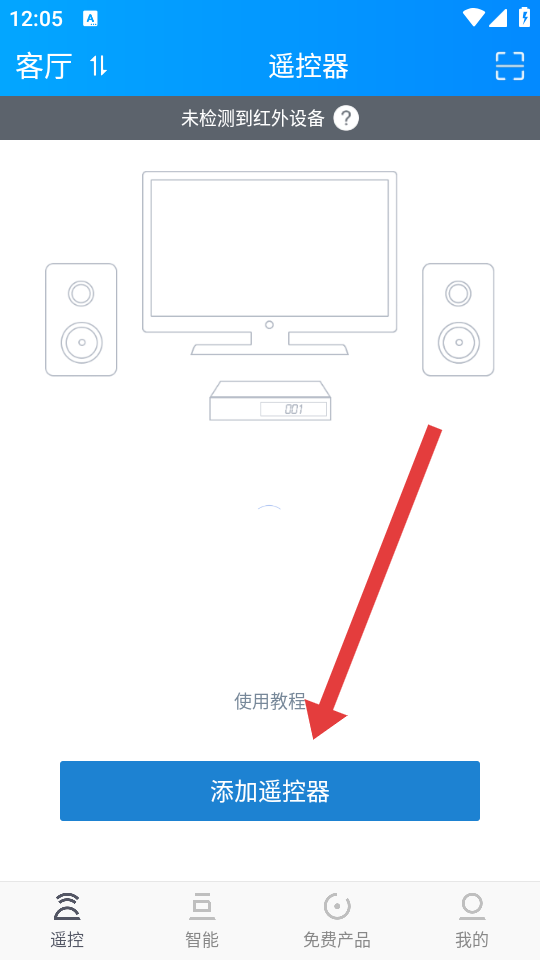 1、打开遥控精灵APP,进入遥控器页面,点击添加遥控器按钮,进入设备添加流程。