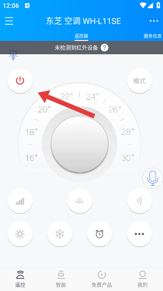 3、进入空调遥控器界面后,点击左上角红色电源键开启空调,后续通过圆形温度调节盘或模式等按钮设置制冷/制热、温度等参数。