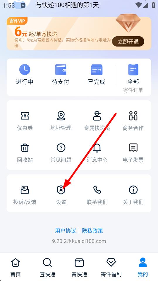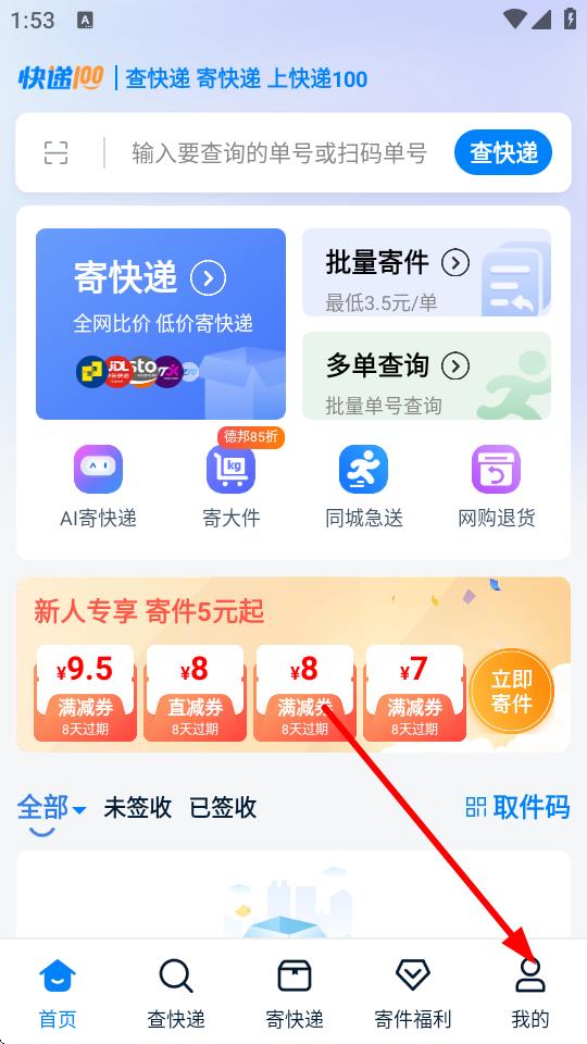 1、打开快递100应用,点击底部导航栏最右侧的我的选项。