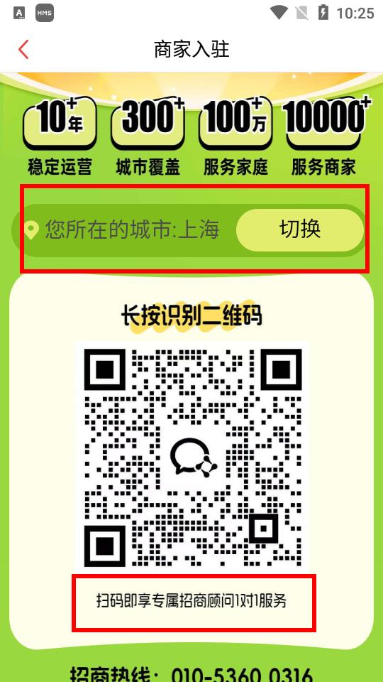 4、进入新页面后可按需切换所在城市,并可通过长按识别二维码获取专属招商顾问1对1服务以完成后续入驻操作。