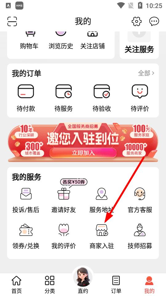 2、在个人界面中,找到并点击商家入驻选项,进入商家入驻介绍页面。