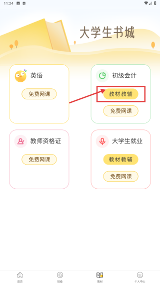 1、打开教育类APP,点击底部教材选项,进入大学生书城页面。