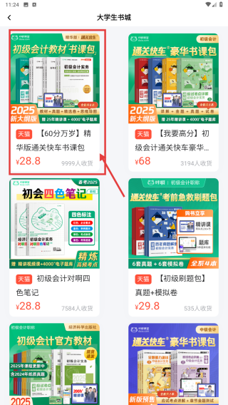 3、在初级会计教材教辅列表页面,找到初级会计教材书课包并点击,进入该教材详情页面。