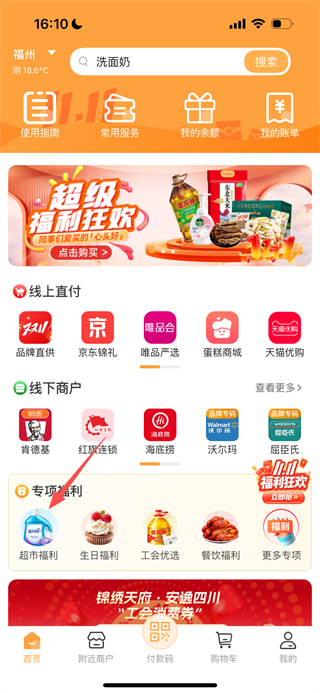 1、在蜀光惠首页,点击超市福利选项,进入超市福利页面。