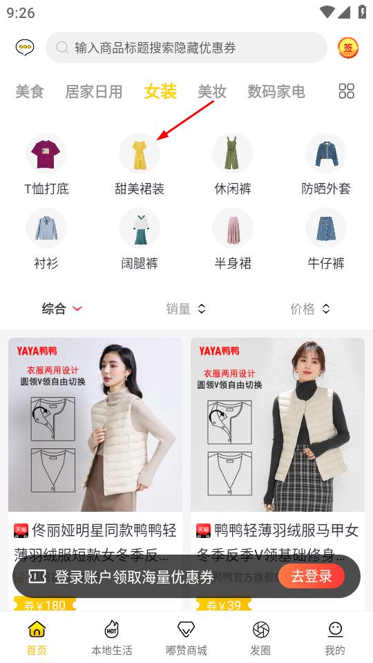 2、在女装页面,点击甜美裙装分类,查看甜美裙装类商品。