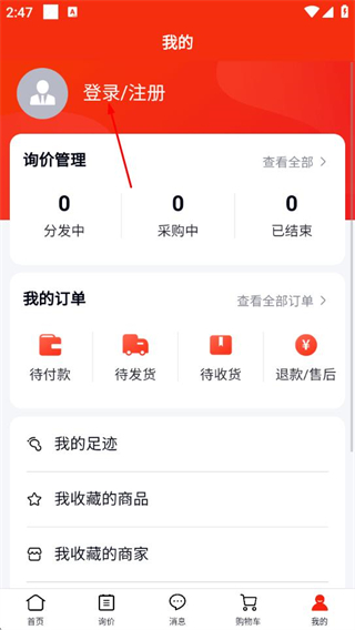 2、在个人页面,点击登录注册选项,进入登录账号页面。