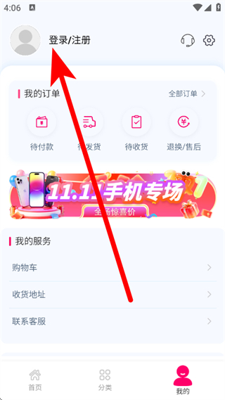 2、在个人中心页面,点击登录注册,进入登录流程。