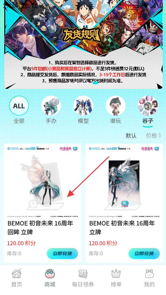 3、在谷子商品列表中,选择心仪商品,如初音未来立牌。