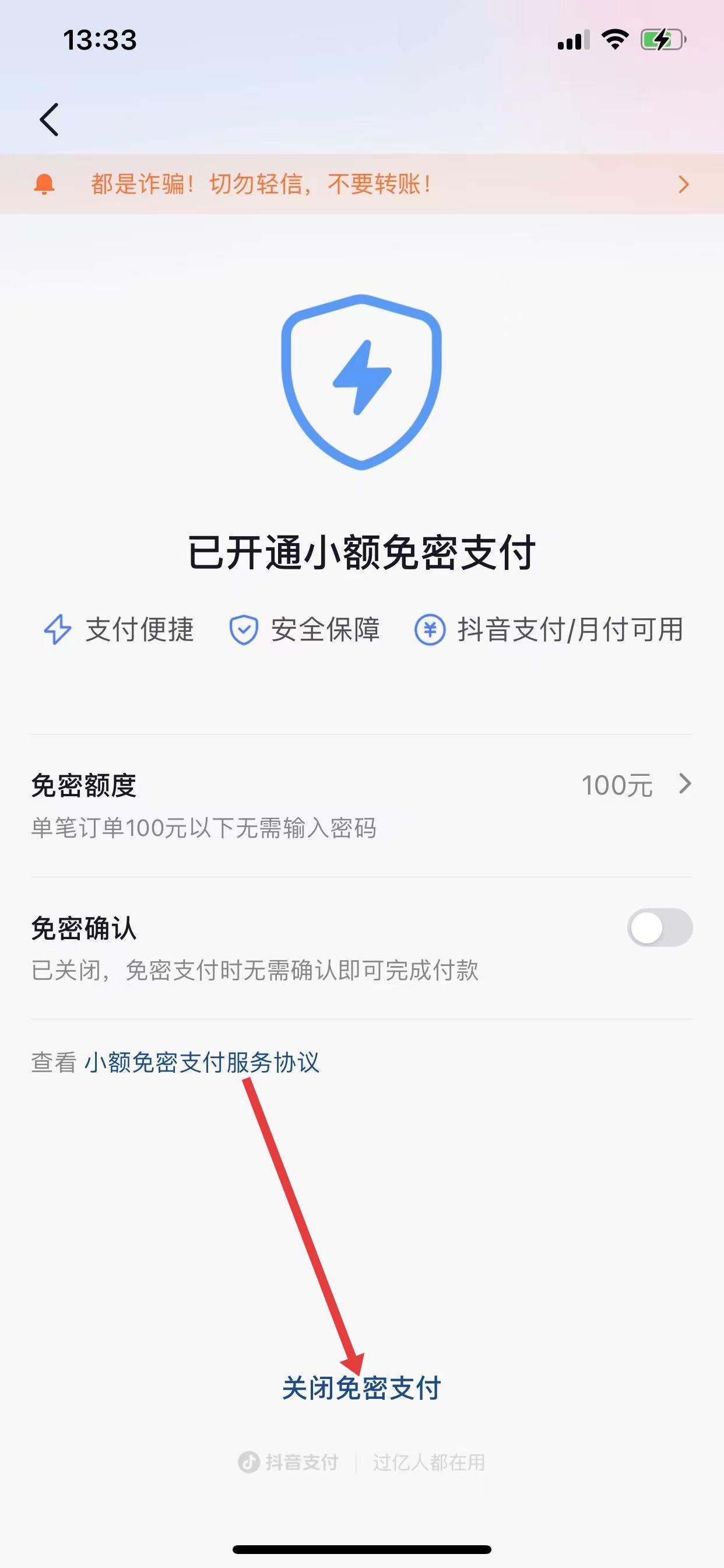 4、拉到页面底部,点击关闭免密支付,即可关闭。