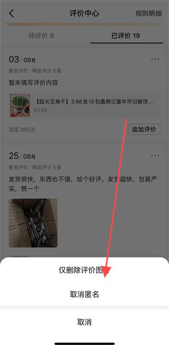 4、最后,点击按钮会弹出弹窗,可以选择取消匿名或者删除评价图片,整个过程非常的简单。