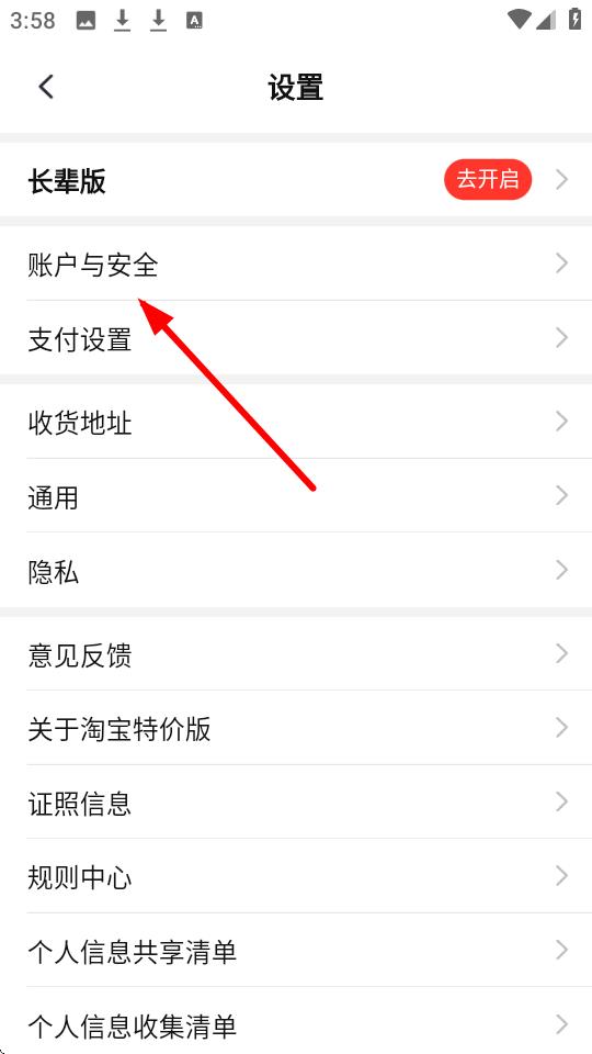2、进入设置页面后,找到并点击账户与安全选项。