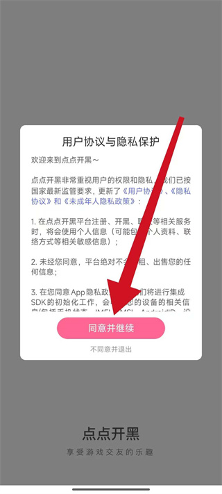 1、打开点点开黑,在弹窗中点击同意并继续,进入主界面。
