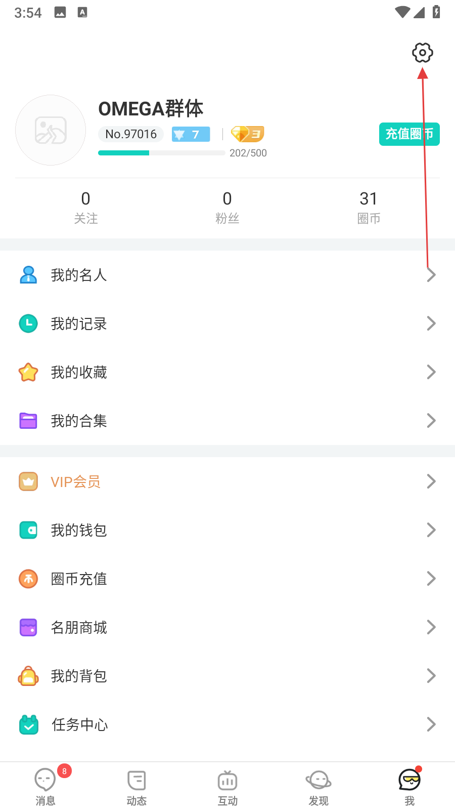 1、打开名人朋友圈APP,进入个人页面,点击右上角的设置图标,进入设置界面。