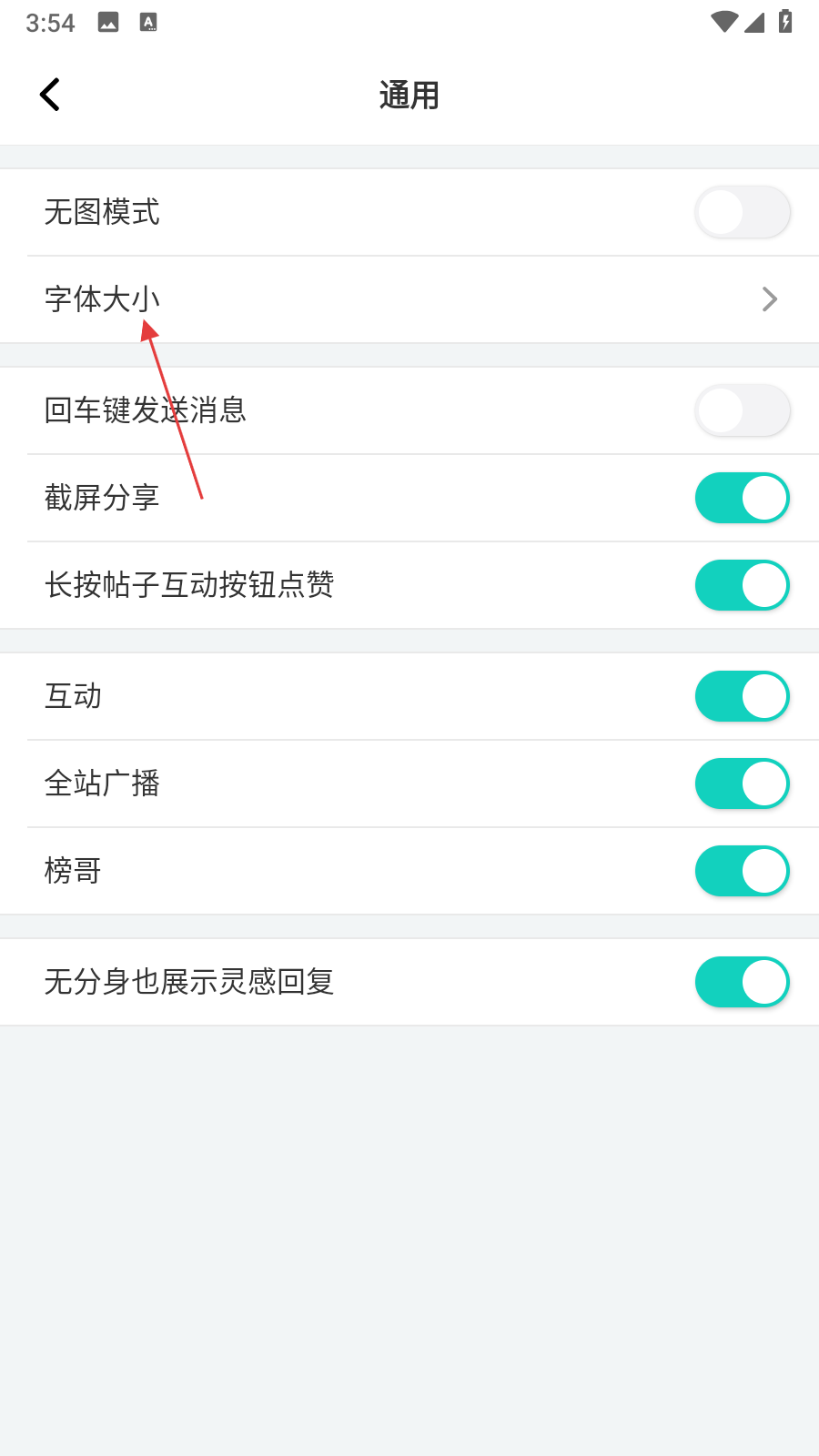 3、在通用设置页面里,找到字体大小选项,点击该选项进入字体大小调节界面。