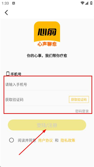 3、在登录界面填写手机号、获取验证码,勾选协议后,点击登录注册完成账号登录操作。