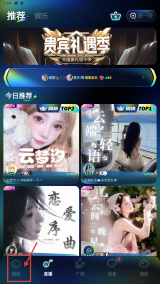 1、打开娱乐类APP,点击底部陪玩选项,进入陪玩服务相关页面。