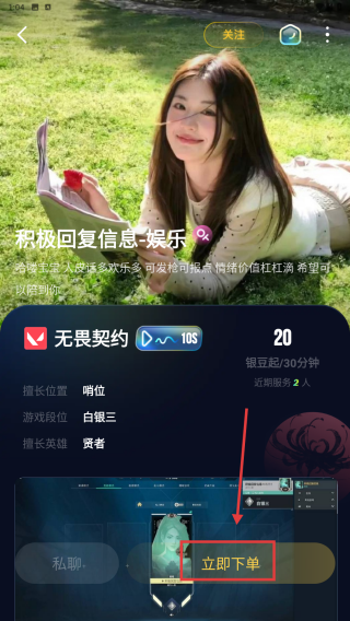 4、在详情页,点击立即下单按钮,即可发起陪玩服务的下单操作。