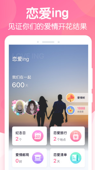 恋爱ing是一款专为情侣打造的秘密空间,在这里有哪些说不出口的誓言,在这里可以偷偷发给她,觉得有些话说出来过于矫情,在这里偷偷捎给他,还有情侣必做的一百件小事,可以一一打卡哦,感兴趣的小伙伴快来下载吧!