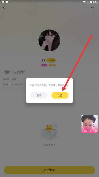 3、在出现的弹窗中点击认证按钮,进行实名认证后开始打招呼。