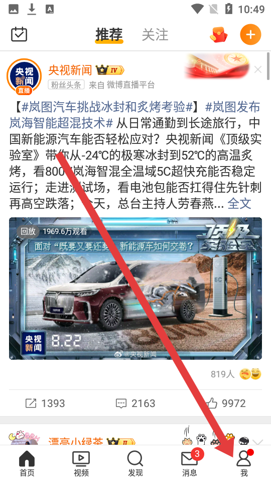 1、打开微博APP,找到并点击底部导航栏右下角的的我,进入个人页面。