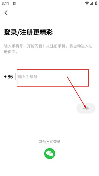 3、在登录/注册页面,填写输入手机号,点击页面箭头按钮,进入验证码输入页面。