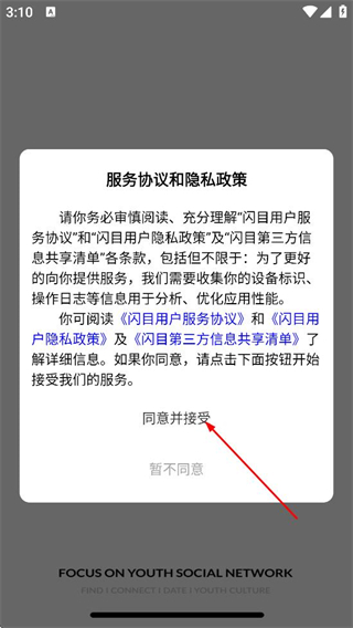 1、在服务协议和隐私政策弹窗中,点击同意并接受按钮,进入闪目欢迎页面。