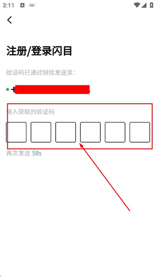 4、在注册/登录闪目页面,填写收到的输入获取的验证码,完成账号的注册与登录。