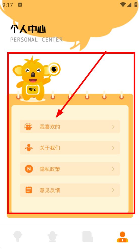3、在【个人中心】,点击【我喜欢的】可查看收藏内容,通过【意见反馈】提交使用问题或建议。
