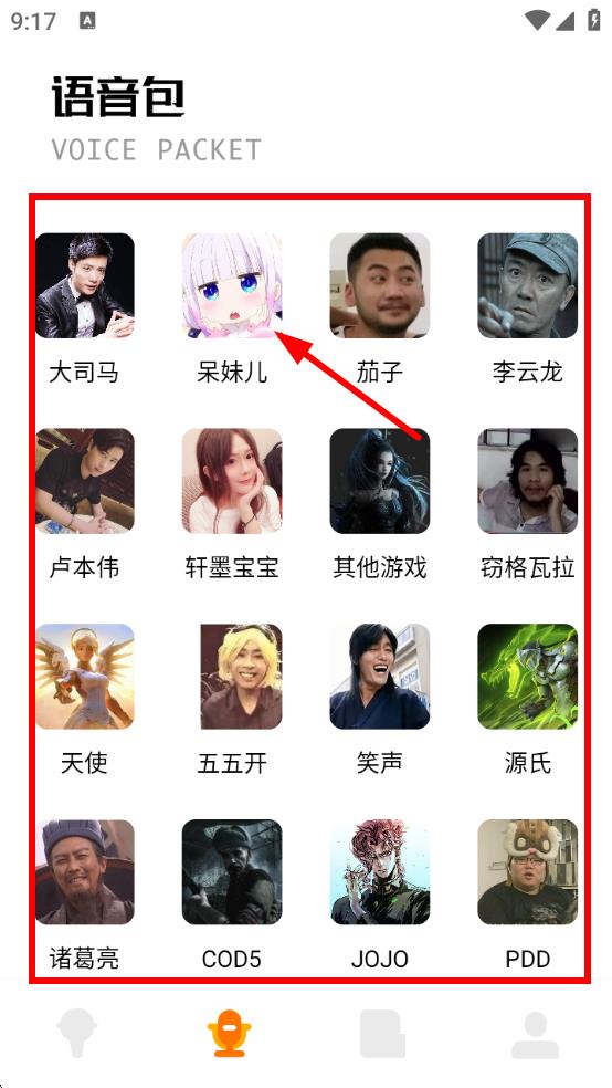 2、进入【语音包】页,点击喜欢的语音包,可使用对应特色语音内容,应用到聊天录音等场景。