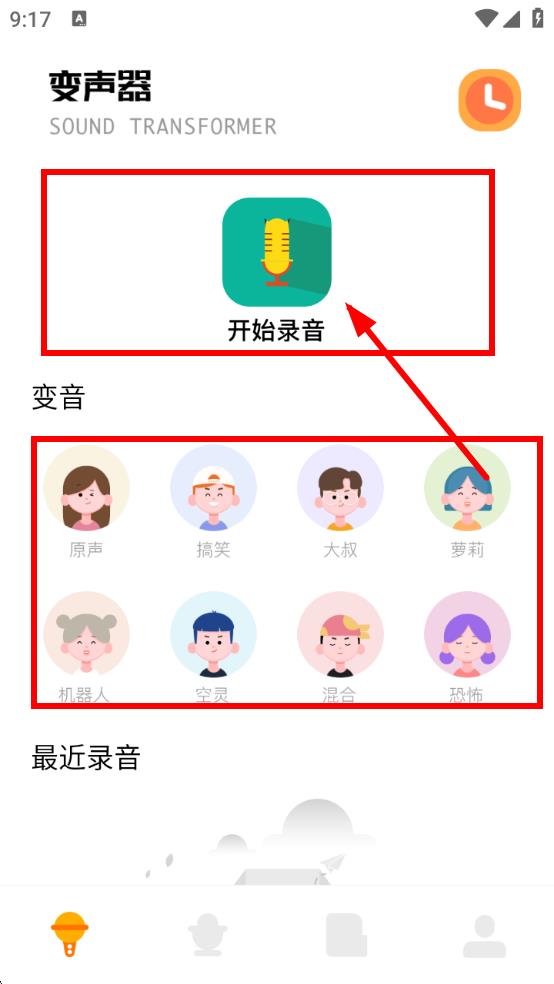 1、点击【开始录音】按钮,同时在【变音】选择人物,录制时声音会按所选特效变化,完成趣味变声录音。
