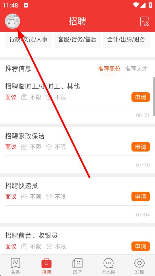 1、打开智慧乌苏app,在招聘页面点击左上角个人头像。