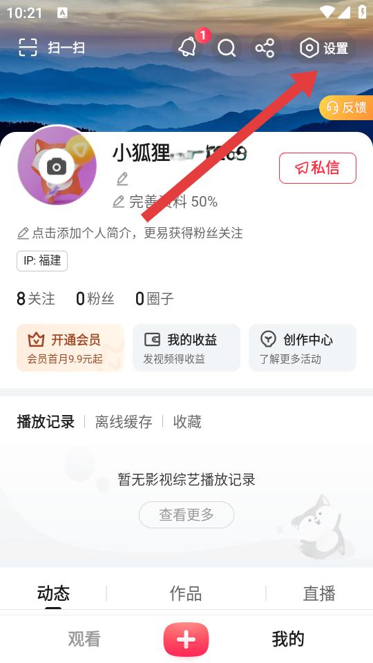 1、打开搜狐视频APP,进入我的页面,点击右上角的设置图标。